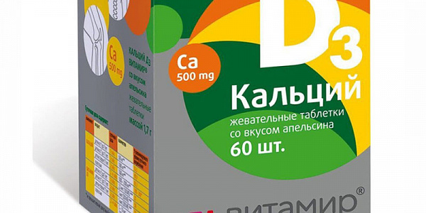 ОписаниеКальций Д3 ВИТАМИР® со вкусом апельсина содержит в своем составе кальций в виде карбоната, его состав содержит 40% элементарного кальция. Дополнительно в добавке есть витамин Д3 (Д3 — активная форма витамина Д), который способствует полноценному усвоению кальция, тормозит его вымывание из костной ткани, регулирует обмен фосфора, нормализует формирование костного скелета, зубов у детей, способствует сохранению структуры костей. Потребность беременных женщин и кормящих матерей в кальции и витамине Д3 повышена. Витамин Д3 образуется в коже под действием ультрафиолетовых лучей. Продуктов, в которых он содержится, не так уж много. К тому же процесс усвоения кальция достаточно сложен. Поэтому прием кальция и витамина Д3 в виде добавок поможет восполнить дефицит этих дружественных между собой элементов.Показания«Кальций D3 ВИТАМИР® со вкусом апельсина, или лимона, или мяты» — это БАД к пище, рекомендуемая в качестве дополнительного источника кальция, витамина D3.Противопоказанияиндивидуальная непереносимость компонентов.ПреимуществаДля производства «Кальцимидион» используется порошок кальция, полученный из створок раковин мидий, добытых в экологически чистой акватории Белого моря. Мидийный кальций обеспечивает максимально полное всасывание кальция в организме.Безопасен.Минимум побочных действий и противопоказаний.СоставАктивные компоненты:кальция карбонат - 1250мг (эквивалентно элементарному кальцию – 500 мг),витамин Д3 (холекальциферол эквивалентно -2,5 мкг (100 МЕ)),вспомогательные компоненты:сахароза,тальк (агент антислеживающий),кальция стеарат (агент антислеживающий),крахмал картофельный,ароматизатор натуральный апельсин.Способ применения и дозыдетям 3-7 лет по 1 таблетке в день во время еды; детям старше 7 лет по 1 таблетке 2 раза в день во время еды; взрослым по 1-2 таблетки 2 раза в день во время еды. Продолжительность приема – 1-2 месяца. При необходимости прием можно повторить.Условия храненияХранить в защищённом от света, недоступном для детей месте, при температуре от 2°С до 25°С и относительной влажности не более 75%.Срок годности 2 годаНе является лекарственным средством.